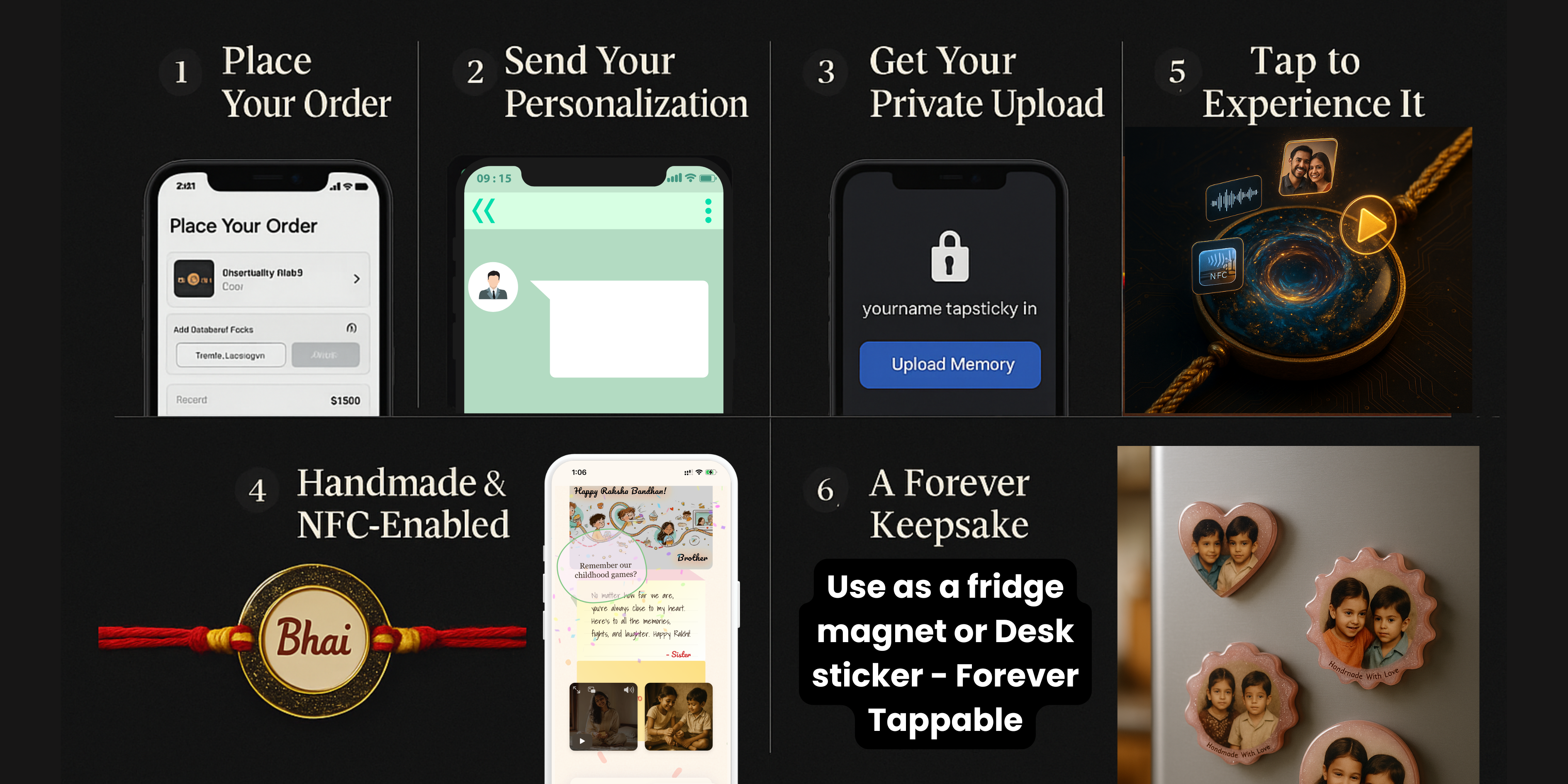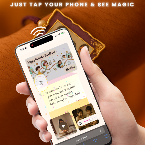 Made with handcrafted resin and powered by invisible NFC tech, the TapSticky Smart Rakhi stores your voice, video, photos, or even shared playlists. Just tap with a phone to relive those precious memories.